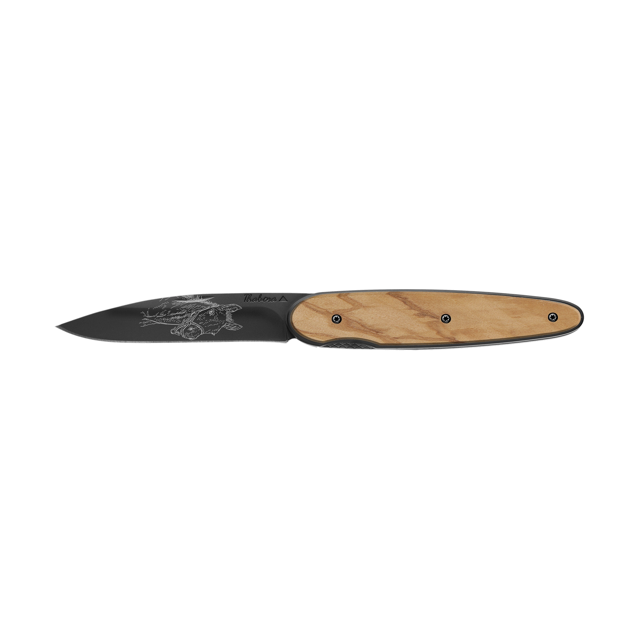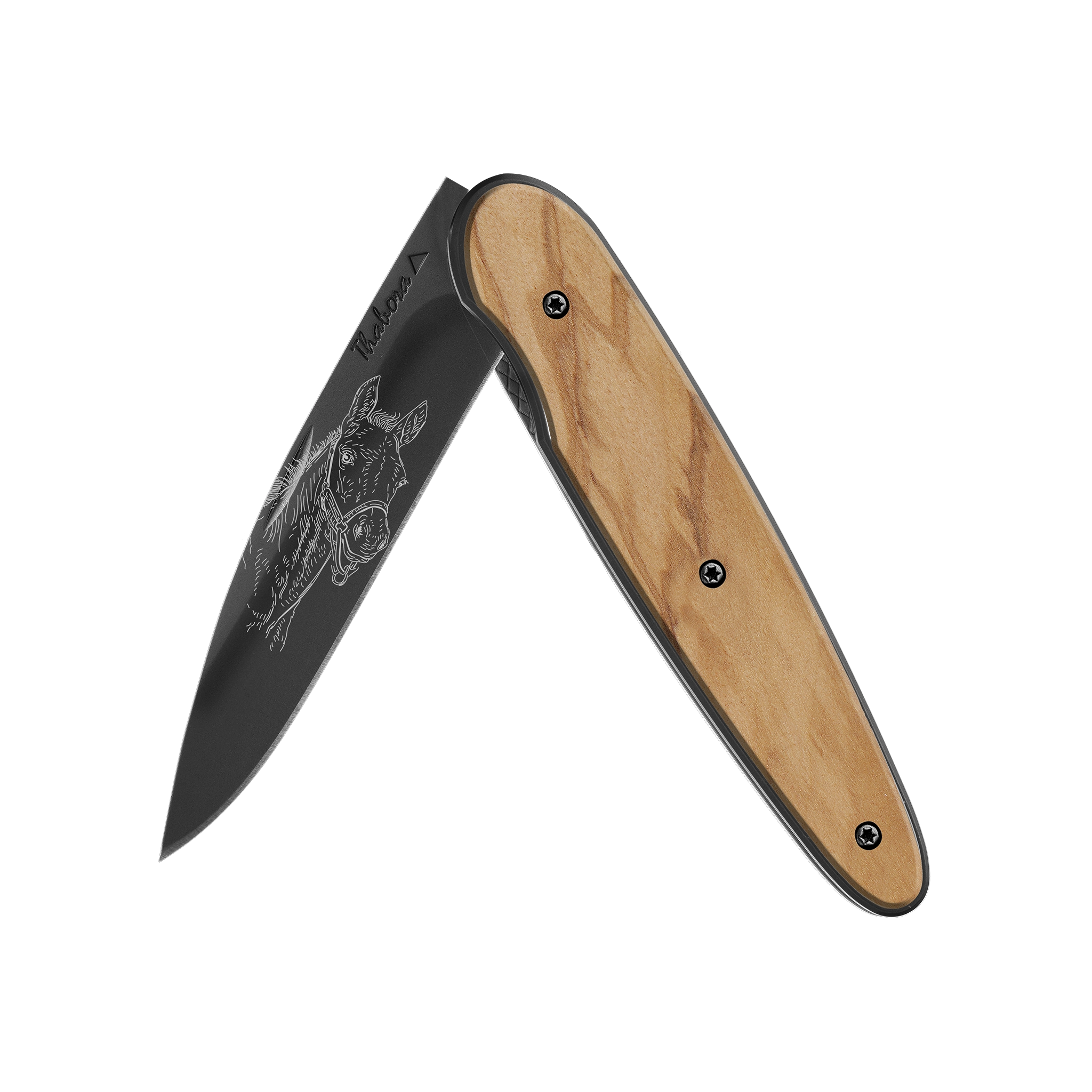 • Couteau acier finition titane noir plaquette pleine bois clair motif «poulain»